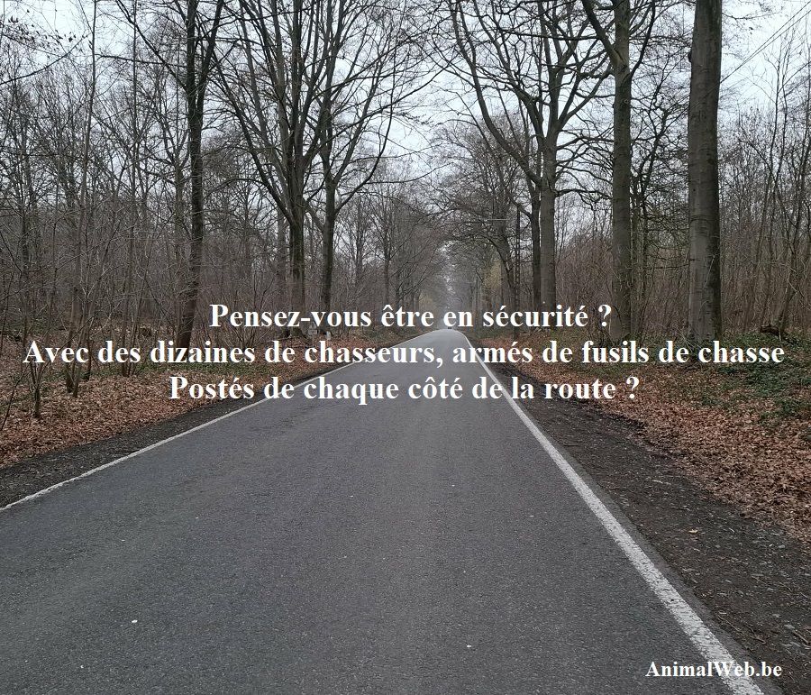 Au-delà du risque de tir, pousser des sangliers pesant entre 70 et 100 kilos vers une route à grande circulation relève d'une inconscience totale. L'animal traqué, paniqué, blessé pourrait forcer le passage et se retrouver sur la route. Ces agissements irresponsables des chasseurs pourrait être la cause d'accident grave : un face à face entre deux véhicules roulant à 70 km/heure, est souvent mortel.