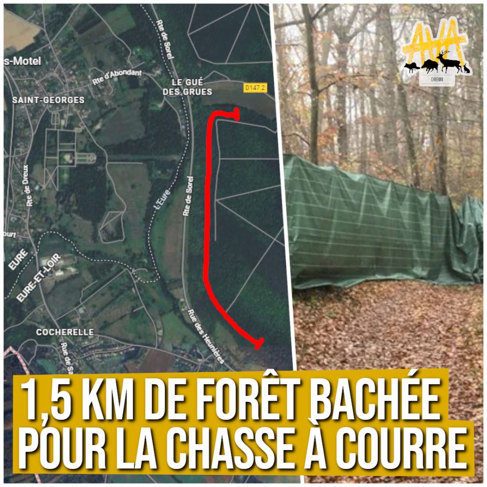 A Dreux, une commune française située dans le département d'Eure-et-Loir, une vision surréaliste a glacé le sang des promeneurs : une bâche plastique de deux kilomètres de long, tendue au cœur de la forêt domaniale. Si les veneurs et les autorités invoquent la sécurité routière, les associations de terrain, menées par AVA (Abolissons la Vénerie Aujourd'hui), y voient un stratagème cruel pour empêcher le gibier d'échapper à la meute de chiens de chasse.
