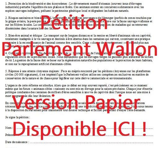 La voie électronique : Pour ceux qui préfèrent l'instantanéité, le portail du Parlement reste ouvert. C'est une méthode sans risque, directe et officielle : Pétition pour l'interdiction de l'importation et du lâcher de gibier d'élevage à des fins cynégétiques en Région wallonne.